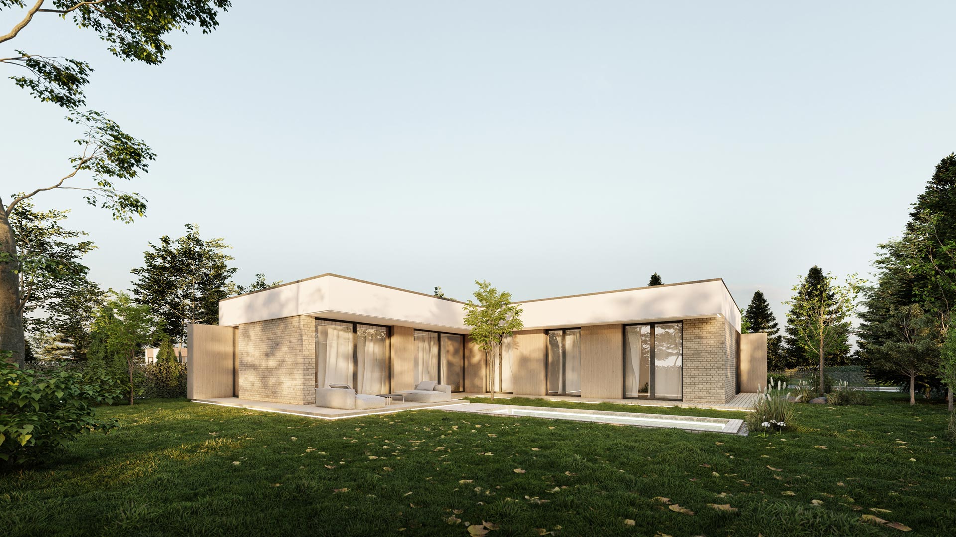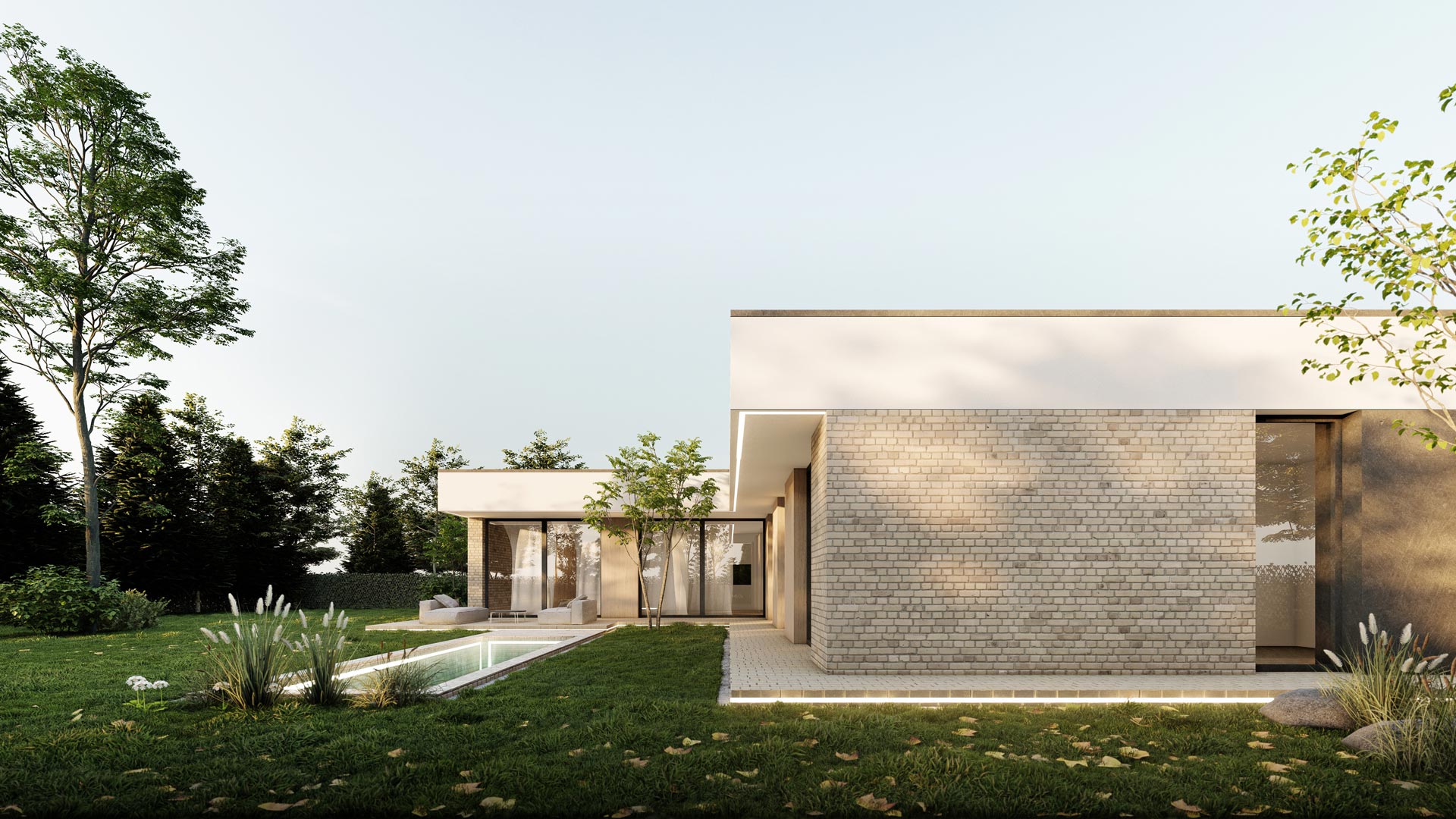 Fasádu domu dopĺňa decentný tehličkový obklad v teplom odtieni cappuccino, ktorý dodáva stavbe textúru, hĺbku a nadčasový charakter. V kombinácii s bielou silikónovou omietkou vytvára harmonický kontrast a prémiový vzhľad.